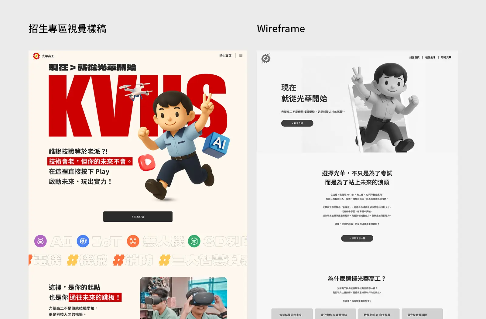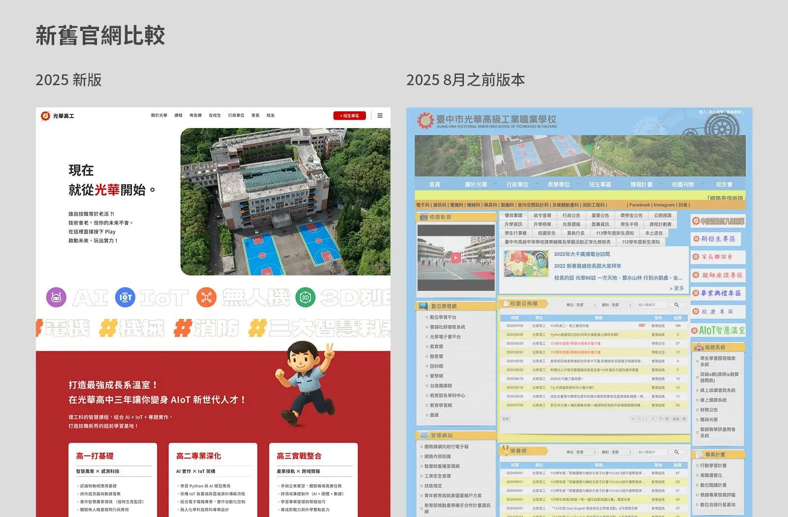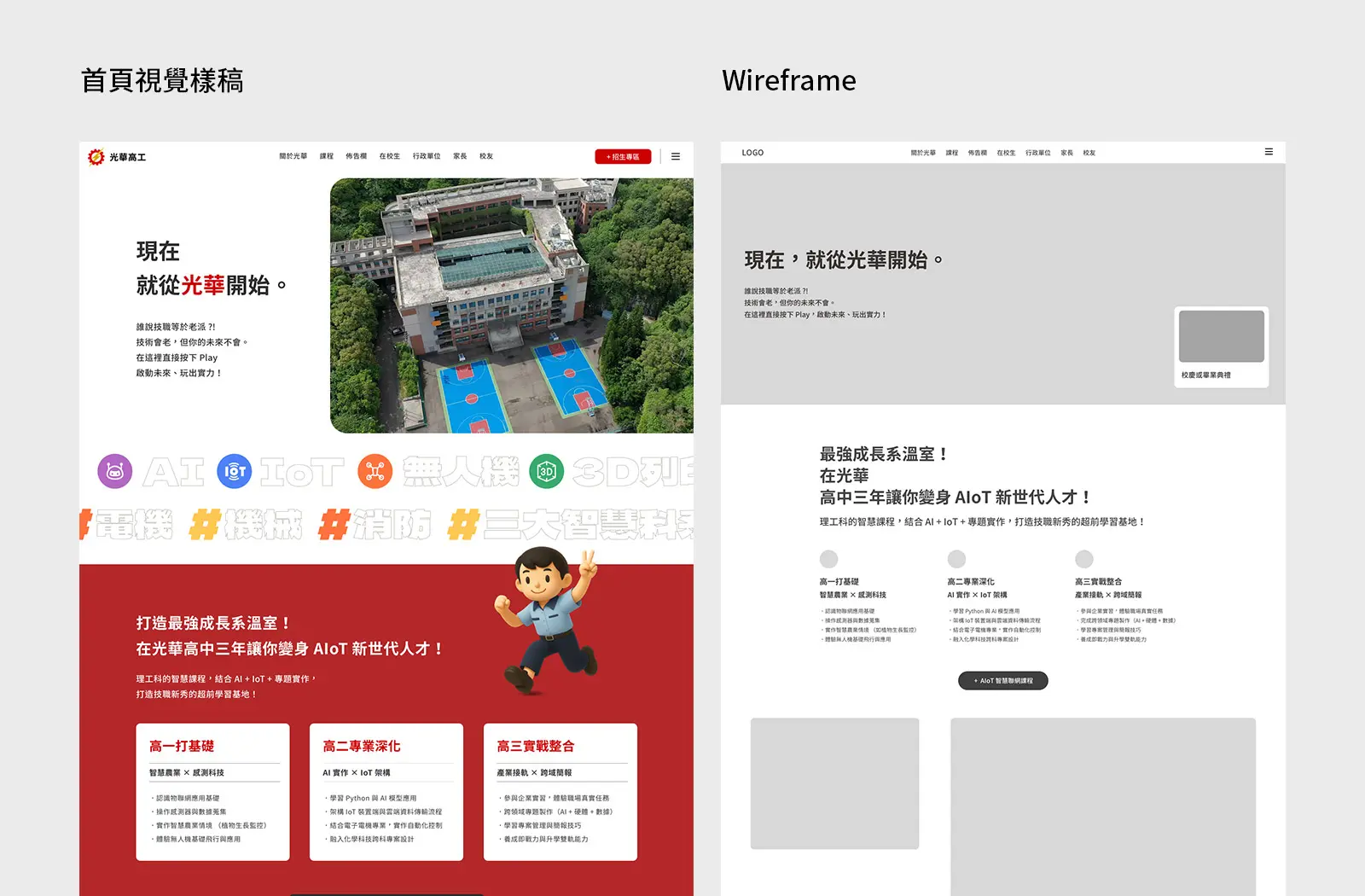 舊站是常見的「國高中標準樣板」:入口密集、資訊堆疊,第一眼就難以下手。Wireframe 階段我們逐一把內容彙整、重排層級,最後的變化:
